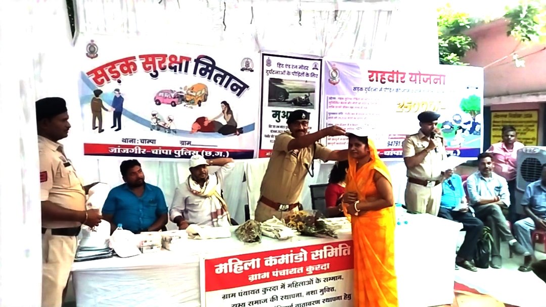 जांजगीर-चांपा जिले की ग्राम कुरदा चांपा में पुलिस कैप्टन.श्री विजय कुमार पांडे ने दो महत्वपूर्ण योजनाओं में ग्रामीणों को जोड़ा।.(1)..महिला कमांडो (2) सड़क सुरक्षा मितान योजना। साथ ही राहगीर योजना का भी मार्गदर्शन किया।।