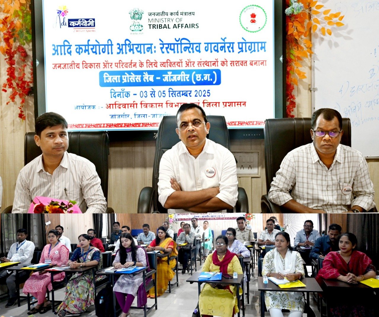 सुहाना लाइव न्यूज़ जांजगीर-चांपा, 03 सितम्बर 2025 जिले में जनजातीय समाज के विकास और सशक्तिकरण हेतु जिला प्रशासन एवं आदिवासी विकास विभाग द्वारा आदि कर्मयोगी अभियान रेस्पॉन्सिव गवर्नेंस प्रशिक्षण कार्यक्रम का आयोजन जिला पंचायत के डीपीआरसी भवन में ब्लॉक मास्टर ट्रेनर्स का तीन दिवसीय आवासीय प्रशिक्षण 03 से 05 सितम्बर 2025 तक का किया जा रहा है। प्रशिक्षण कार्यक्रम का उद्देश्य जनजातीय क्षेत्र में विकास एवं परिवर्तन के लिए व्यक्तियों और संस्थाओं को सशक्त बनाना है।